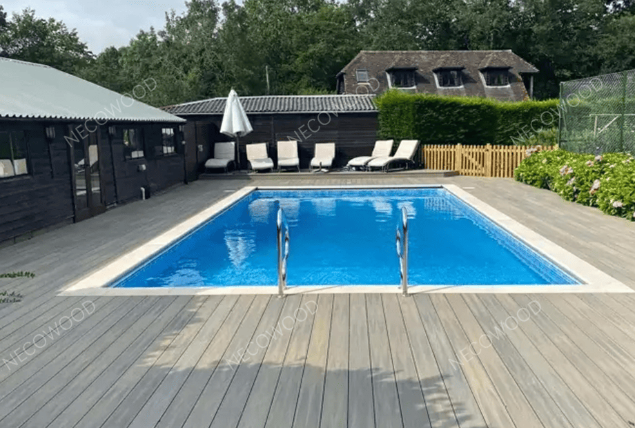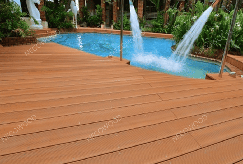 NECOWOOD fabriqueplanches de terrasse en bois composite, terrasse bois plastique composite, etterrasse composite coifféeconçu pour une utilisation en extérieur et au bord de la piscine.